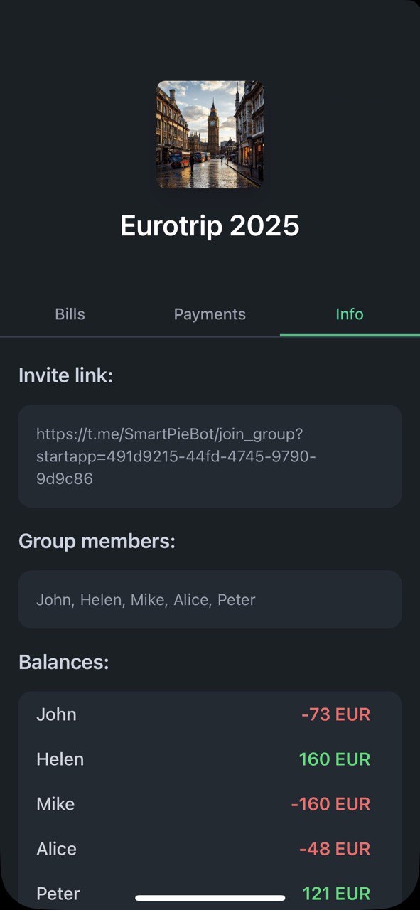 SmartPie Bot is a completely free mini-app in Telegram. Just send a photo of a receipt, the bot recognizes the items and helps quickly distribute expenses among participants.